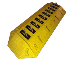 This directional spike system is used to control traffic in one direction. Vehicle may enter, but not exit, without severe tire damage. Spring loaded spikes remain up and easily go down when vehicles pass over the system in the correct direction; however, if passing over it in the opposite (incorrect) direction, tires will be punctured. A Surface mounted spike system also serves as a speed bump to slow down the flow of traffic to the recommended 5 MPH